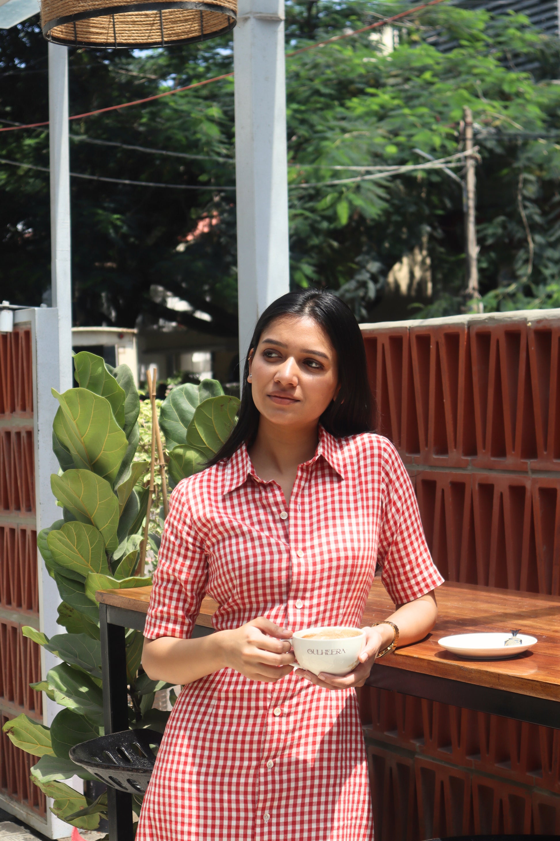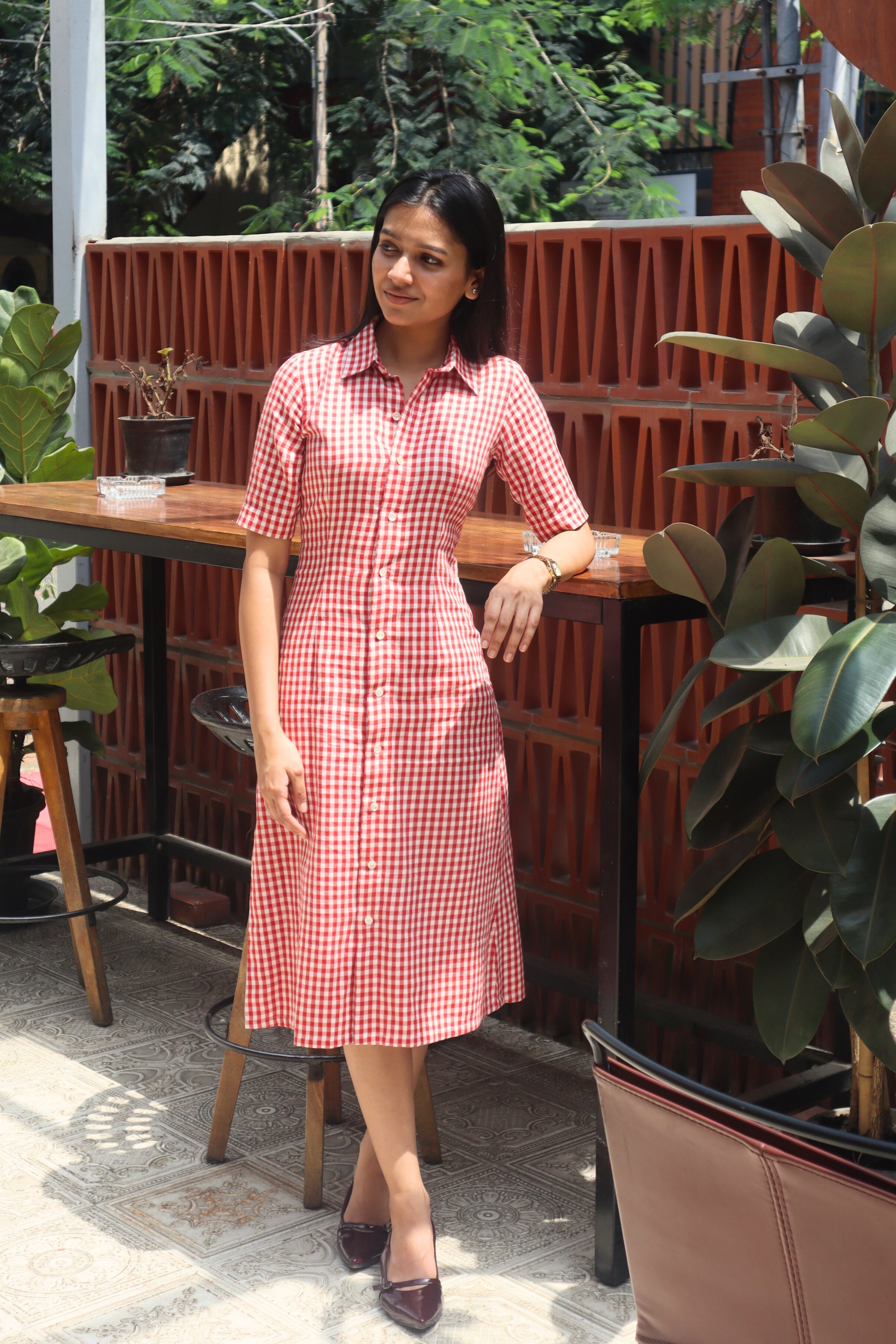 Effortlessly timeless, the Olivia Dress brings a touch of vintage charm to modern-day elegance. Crafted from breathable cotton, this dress features a classic red-and-white checkered pattern that exudes playful sophistication. The tailored silhouette, button-down front, and collared neckline offer a polished yet easygoing appeal — perfect for brunches, workdays, or weekend strolls.
